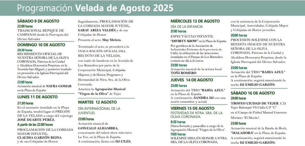 damit Ihr schon vorab sehen könnt, wann welche Events in Vejer de la Frontera 2025 stattfinden werden, hat unser Ayuntamiento folgende Liste vorbereitet. Diese Events, die u.a. vom Ayuntamiento organisiert worden sind, sind festgelegt. Im Laufe der nächsten Wochen/Monate werden noch weitere Events vom Rathaus und/oder Bars und Restaurants organisiert.