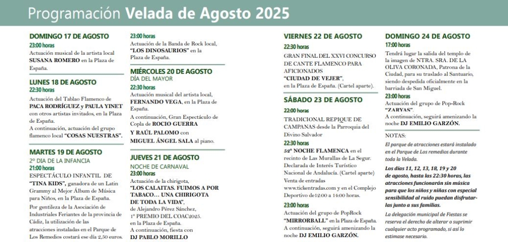 in Vejer ist jetzt das Sommerfest (bis zum 24. August) mit einem Kirmes und viel Live-Musik auf der Plaza de España. Anbei ist das Programm des Sommerfest.