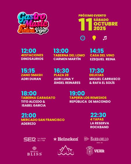 Am Samstag das Gastro-Music-Festival Vejer. Viel Livemusik auf den Strassen in Vejer. Die Uhrzeit und in welcher Bar/Restaurant das nächste Konzert stattfindet ist hier zu sehen.